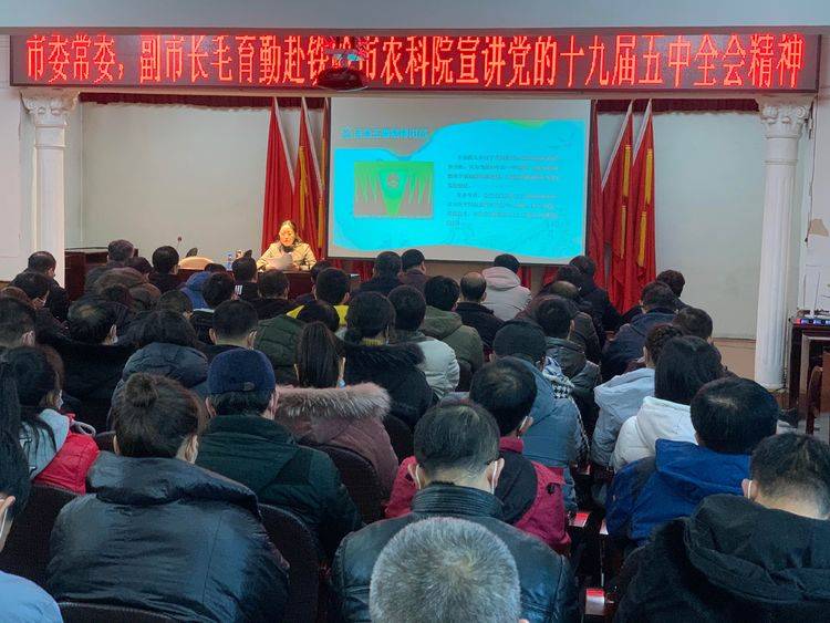 2020年12月17日下午市委常委副市长毛育勤、市政府秘书长张啸龙、市农业农村局副局长李学武、市政府三科科长周纪等一行赴市农科院宣讲及调研。农科院院长张伯岩及院领导班子精心组织全院科研人员及全体职工参加学习。