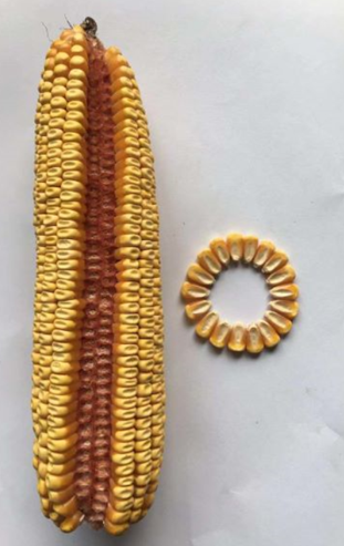 株型半紧凑,株高264cm左右,穗位高102cm左右,成株叶片数大约20片。果穗为筒型,穗长大约20.2cm,穗行数14-18行,穗轴红色,籽粒黄色,穗中部籽粒为马齿型,百粒重约36.2g,出籽率约87.6%。经测定,籽粒容重746g/L,粗蛋白含量11.34%,粗脂肪含量4.79%,粗淀粉含量73.48%。