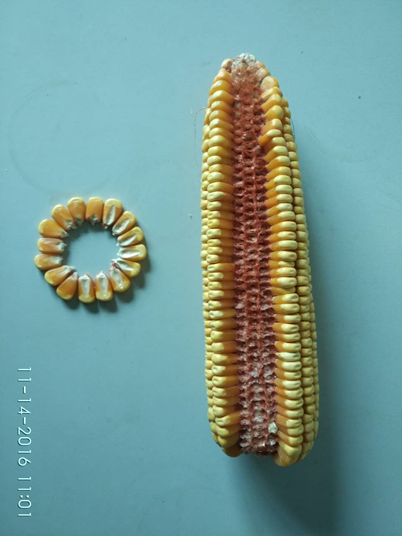 辽宁省春播生育期129天左右,与对照迪卡516同期,需活动积温2853℃左右,属于中晚熟玉米杂交种。幼苗叶鞘紫色,株型紧凑,株高283cm左右,穗位高123cm左右,成株叶片数大约20片。雌穗花丝紫色,雄穗花药紫色。果穗为筒型,苞叶中,穗长大约17.8cm,穗行数14-16行,穗轴红色,籽粒黄色,穗中部籽粒为半马齿型,百粒重约34.9g,出籽率86.4%。